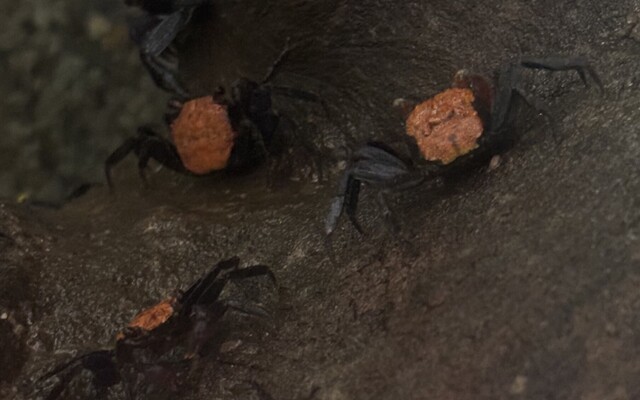 Vampire Crabs are peaceful toward fish but can be territorial with their own kind, so provide plenty of hiding spots such as caves, rocks, and driftwood. They are scavengers by nature and help keep the tank clean by eating leftover food, detritus, and algae.