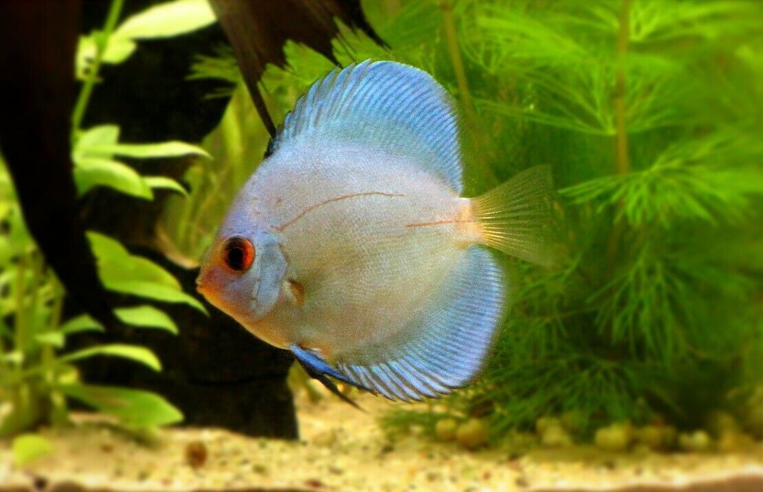 The Blue Diamond Discus thrives in warm, soft water with gentle currents, making it ideal for well-planted aquariums with plenty of hiding spots. Its brilliant blue coloration makes it a showstopper, while its peaceful nature allows it to co-exist harmoniously with other calm fish. This Discus is a perfect choice for aquarists looking to add a touch of serenity and beauty to their tanks. 🌿