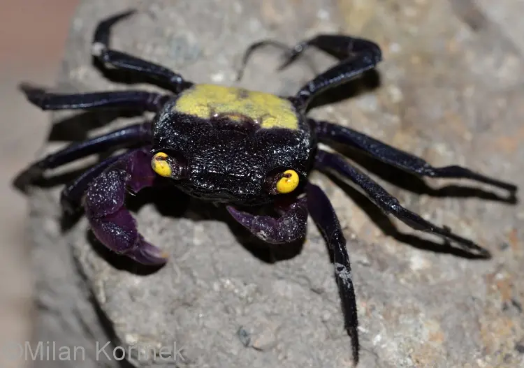 The Vampire Crab is one of the most striking freshwater invertebrates you can add to your aquarium or paludarium. With its deep purple body, bright orange claws, and glowing yellow eyes, it looks like a creature straight out of a fantasy world. Native to small streams and forest floors in Southeast Asia, these semi-terrestrial crabs thrive in environments that offer both land and water areas.